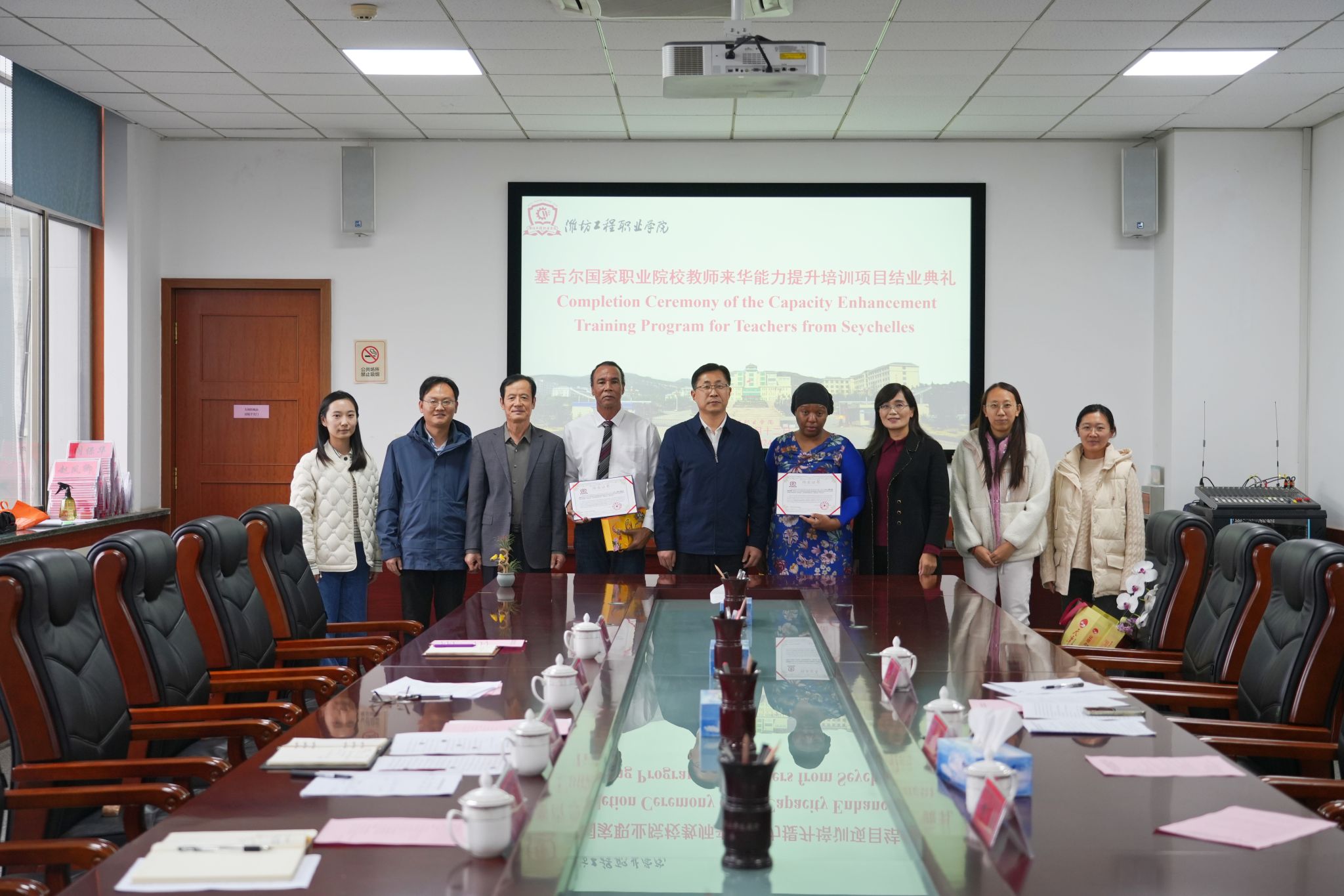 王忠山对Kennet Fred Esparon、Lynn Maria Jean-Baptiste顺利结业表示祝贺,他回顾了学院与塞舌尔职业教育交流合作情况,并表示将以此次培训为契机,与塞方携手并进,在职业教育课程资源建设、教师培训、学术交流、学生访学等方面,进一步加强交流与合作,努力为增进中塞友谊作出更大贡献。王忠山为参训教师颁发结业证书。