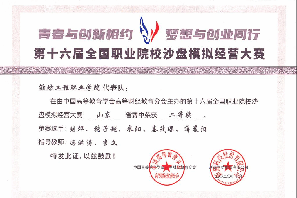 近日,由会计与统计学院教师冯洪涛、李文指导的代表队在第十六届全国职业院校沙盘模拟经营大赛山东省总决赛中获得大赛团体二等奖。