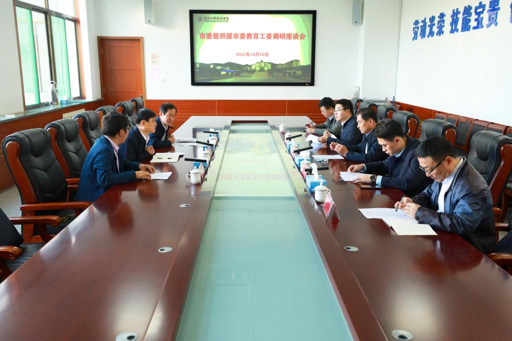 10月10日下午,市委组织部组织一科科长刘树东、市委教育工委党建科科长史祥华等一行5人到我院调研党建工作并召开座谈会,副院长王金明,党委委员、组织人事处处长冯永光等参加座谈。