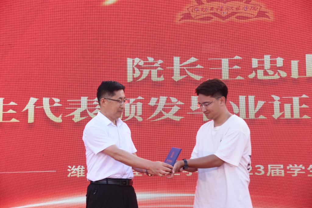 典礼在庄严的国歌声中拉开帷幕。吕尧良为校友联络员代表颁发了聘书。王忠山为毕业生代表颁发毕业证书,他和2023届毕业生们共同回忆了亲历祖国腾飞的自豪与荣光、团结抗击疫情的责任与担当、纯真大学生活的多彩与难忘。他向全体毕业生提出了殷切希望,要脚踏实地,在实干苦干中力学笃行,在国家和人民最需要的地方,让“做精做实、创业创造”的校训精神转化为现实工作中的青春力量,在实践中淬炼青春,在拼搏中磨砺青春,让青春在全面建设社会主义现代化国家的火热实践中绽放绚丽之花;要直面挑战,在急难险重中奋勇争先,永远保持越是艰险越向前的无畏精神,在大风大浪面前站得住,在风险挑战面前扛得住,以勇敢的姿态激扬青春,不负时代,不负芳华;要自信自强,在坚持不懈中攻坚克难,永远保持心中的热忱与坚持,不为困难却步,不向挫折低头,努力向前走一步,就离梦想更进一步,以自强不息的奋进精神展现青年一代的昂扬风采。