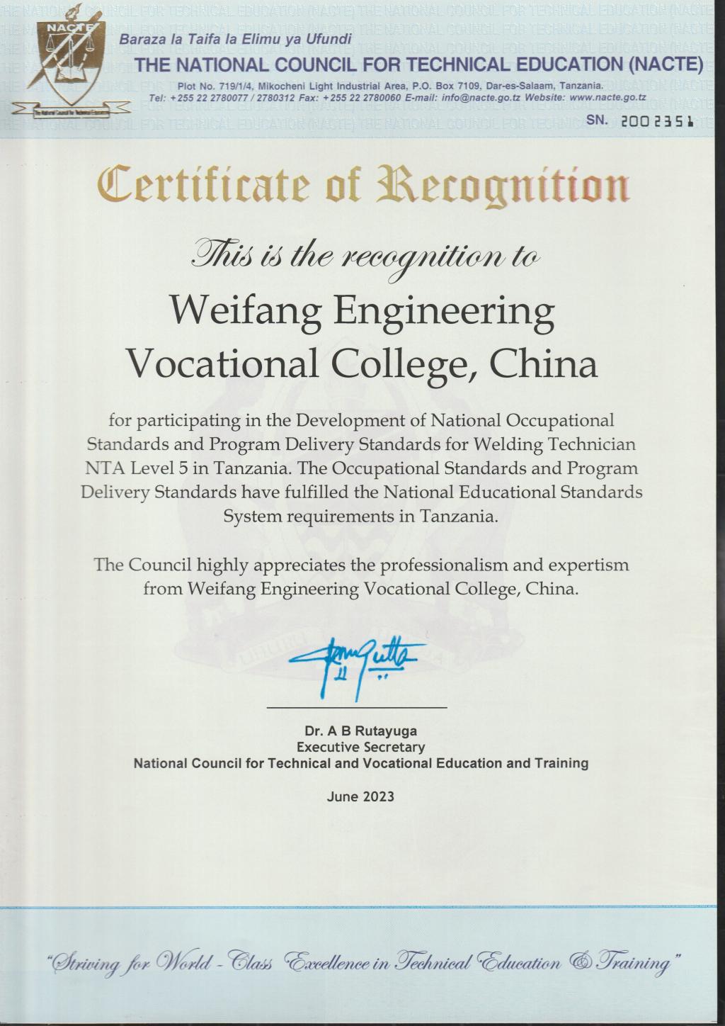 近年来,学院以山东省高水平专业建设群为依托,于2022年10月成功获批第二批“坦桑尼亚国家职业标准开发项目”立项建设单位。立项以来,学院组建工作专班,多次与坦桑尼亚教育部国家职业教育委员会专家召开工作会议进行深入研讨,认真调研和比对中非职业标准,结合坦桑尼亚实际现状与需求,开发并修订完善了焊接技术员5级职业标准以及配套专业教学标准,最终顺利通过坦桑尼亚教育部国家职业教育委员会注册认证并获得官方认证证书,正式纳入坦桑尼亚国家职业教育体系。至此,我校共向坦桑尼亚输出计算机工程技术员6级和焊接技术员5级两项职业标准,进一步提升了学院国际影响力和国际化办学水平。