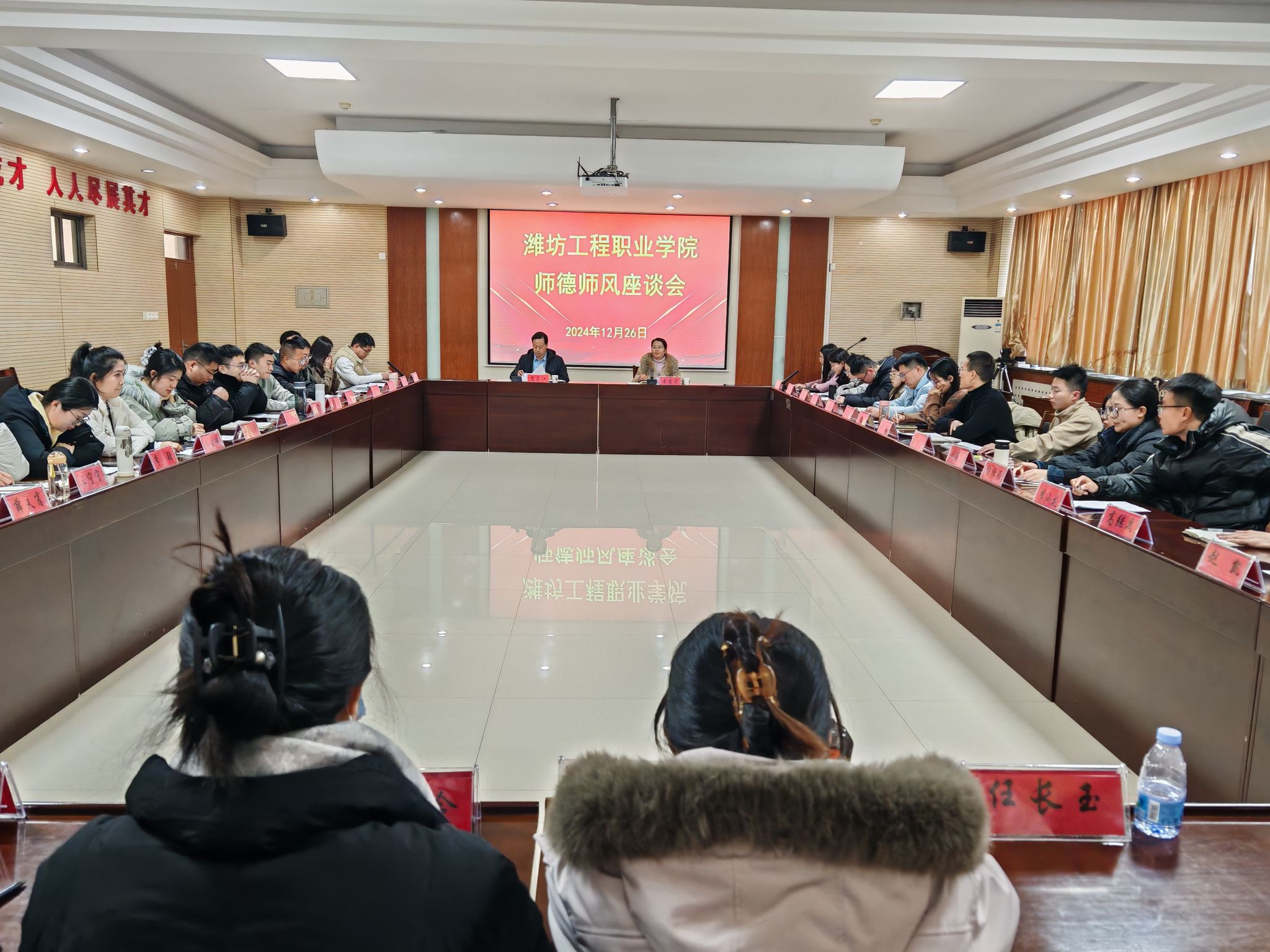会后,在海岱阁606会议室举行了师德师风座谈会。党委委员、组织人事处处长高乐江出席座谈会。2024年新入职教师共40余人参加。教师代表围绕师德师风建设,结合自身岗位工作谈感受、谈体会,积极为学院发展建言献策。老师们畅所欲言,现场气氛活跃。