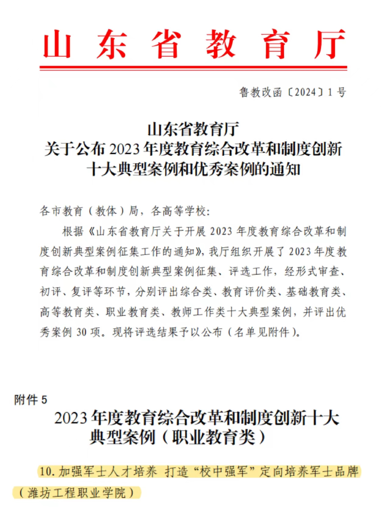 近日,山东省教育厅公布了2023年度教育综合改革和制度创新十大典型案例评选结果,我院提交的案例《加强军士人才培养 打造“校中强军”定向培养军士品牌 》获评“2023 年度教育综合改革和制度创新十大典型案例(职业教育类) ”。