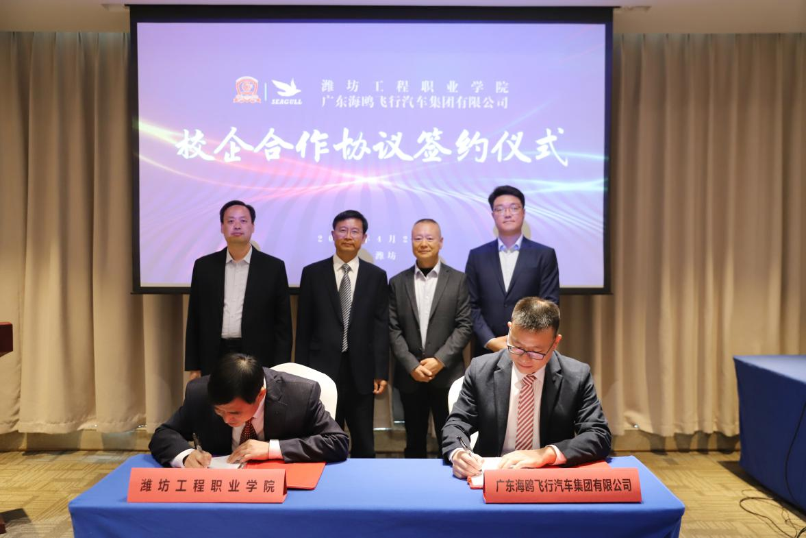 4月2日上午,我院与广东海鸥飞行汽车集团有限公司在潍坊举行校企合作签约仪式。党委书记吕尧良,党委副书记王金明,党委委员、党政办公室(统战部)主任(部长)高乐江;广东海鸥飞行汽车集团有限公司总工程师杨革,高级顾问丁继勇,项目经理高辉出席签约仪式。