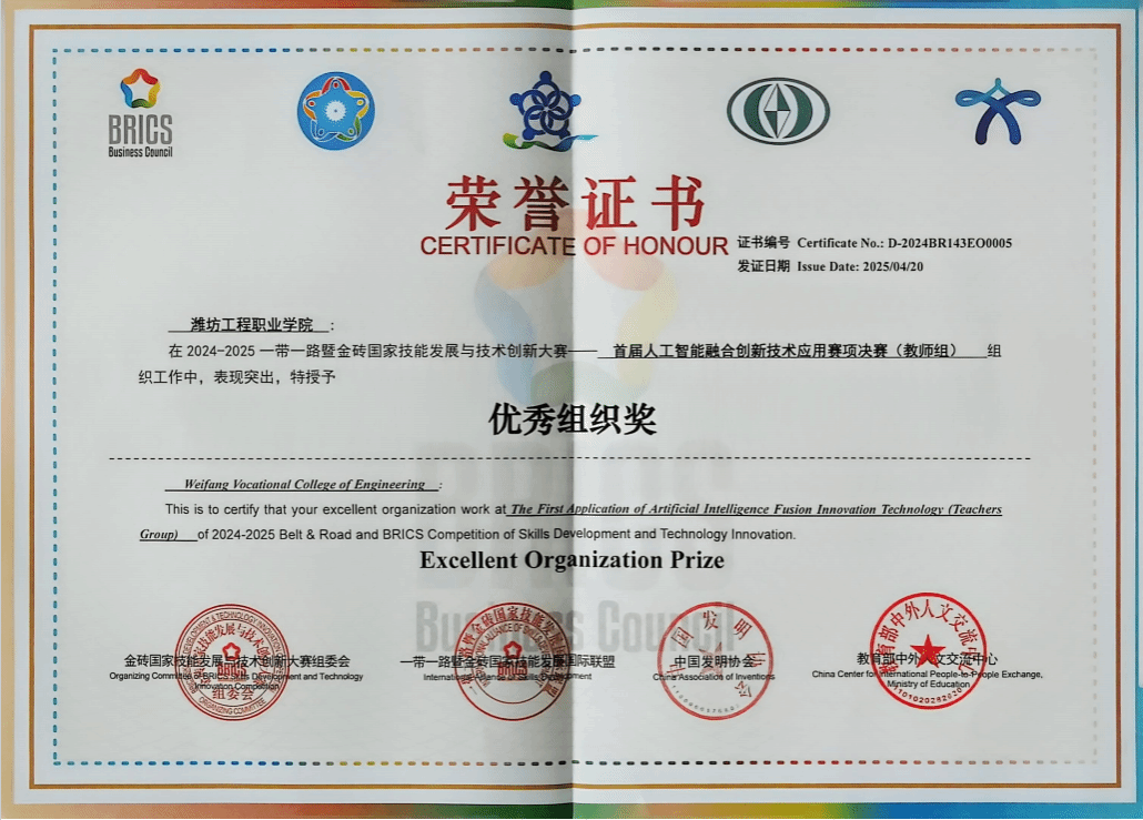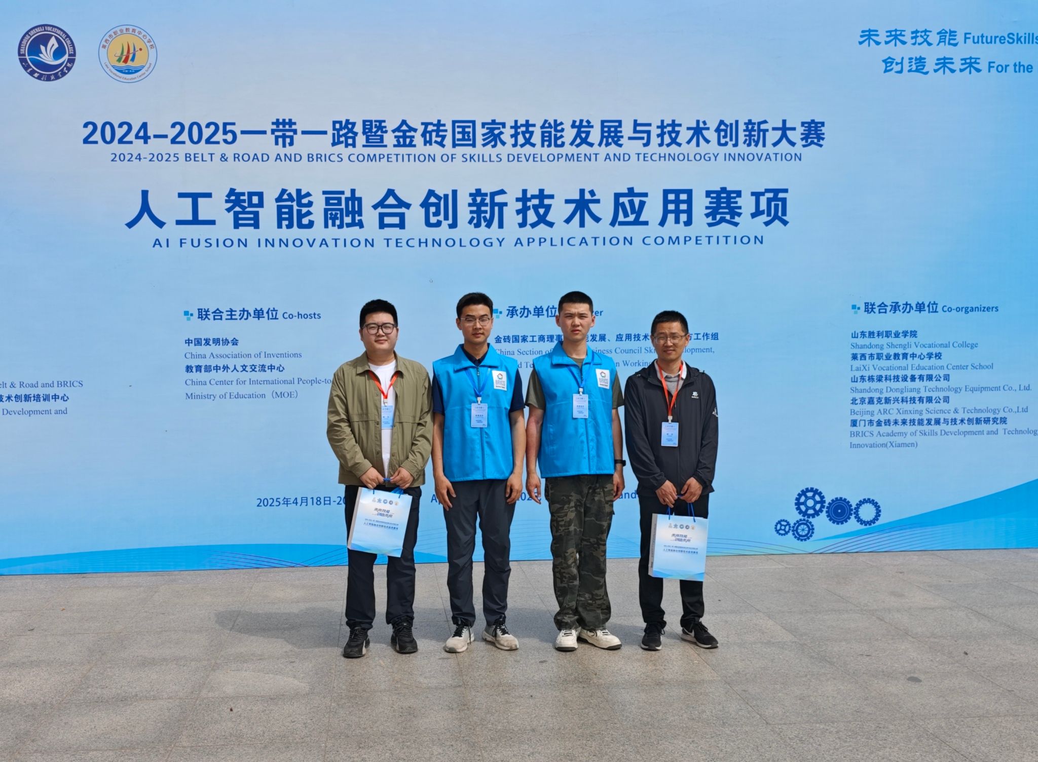 近日,2024-2025“一带一路”暨金砖国家技能发展与技术创新大赛人工智能融合创新技术应用赛项在山东胜利职业学院举行,来自全国各地的32支代表队、68名选手同台竞技。经过激烈角逐,我校机电工程学院教师王成华获二等奖1项,学生宋志强、武新培获二等奖、三等奖各1项,教师杜鑫获“优秀指导老师”,学校被授予“优秀组织奖”。
