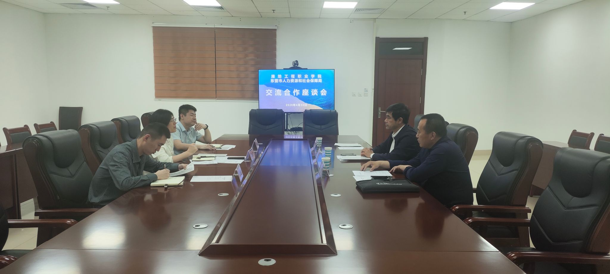 在东营市,杜福杰一行与东营市人力资源和社会保障局公共就业和服务中心相关负责同志开展大学生供需调研座谈。杜福杰介绍了学院概况、专业设置、人才培养特色以及2025届毕业生、2026届实习生的基本情况。双方就人才供需、就业见习、校政共育共推等进行了深入交流。