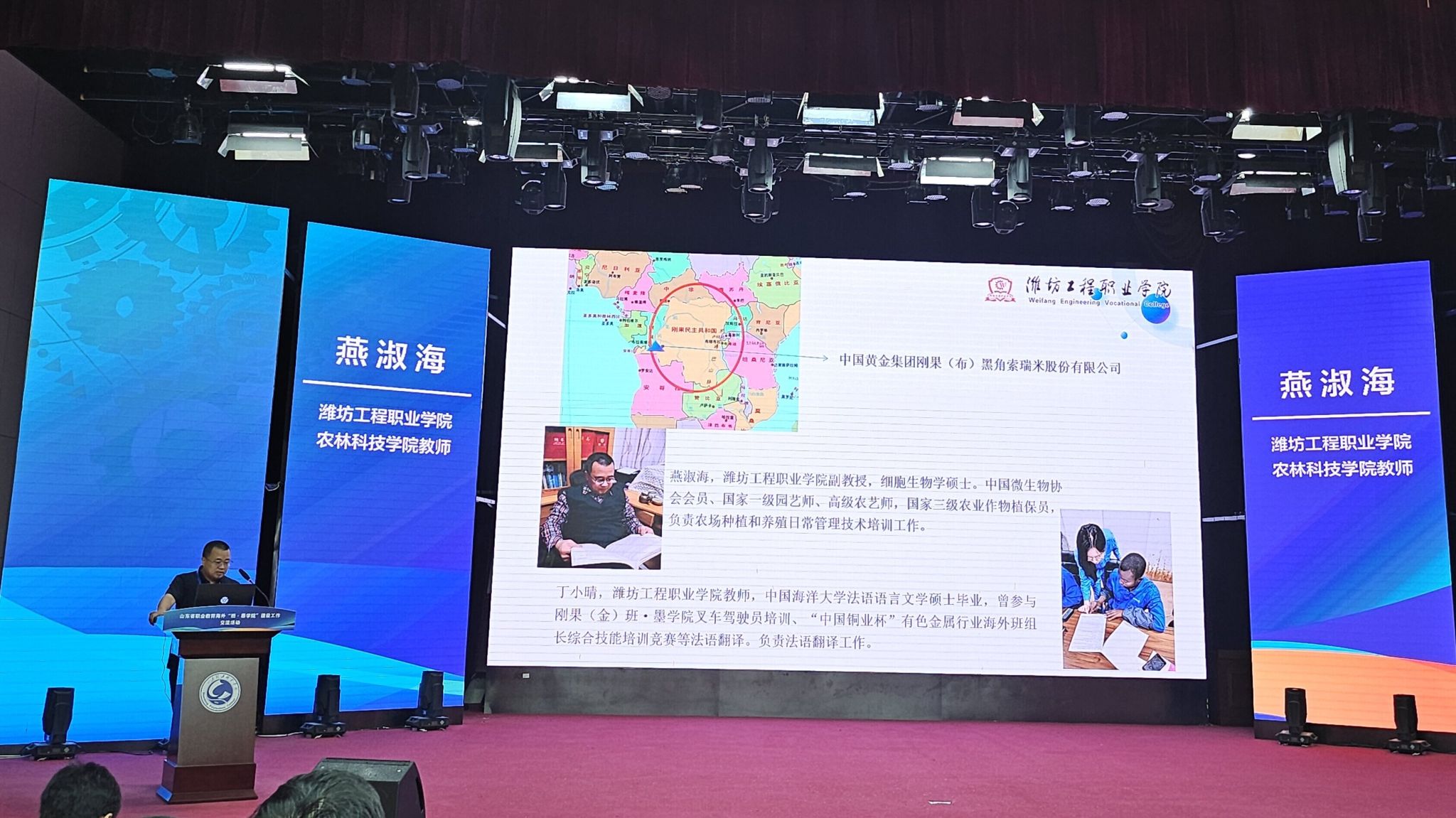 燕淑海以《从培真书院到刚果农场:百年潍工的职教出海实践与担当》为题,分享了他与国际合作与交流学院教师丁小晴一起在中国黄金集团刚果(布)黑角索瑞米股份有限公司参与海外班·墨学院建设的典型做法,深情讲述了他在农场一线,带病坚守岗位,把脉支招解决企业农场实际难题的奋斗历程,展现了潍工人以专业服务“一带一路”建设的使命担当。