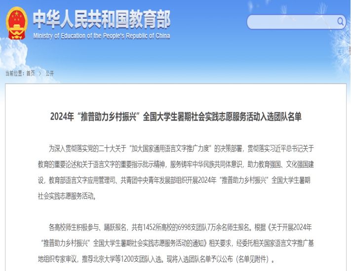 为深入贯彻落实党的二十大关于“加大国家通用语言文字推广力度”的决策部署,贯彻落实习近平总书记关于教育的重要论述和关于语言文字的重要指示批示精神,服务铸牢中华民族共同体意识,助力教育强国、文化强国建设,引导学生为中国式现代化贡献青春力量,教育部语言文字应用管理司、共青团中央青年发展部于2024年暑期继续开展“推普助力乡村振兴”全国大学生暑期社会实践志愿服务活动。全国共有1452所高校的6998支团队、7万余名师生报名,经国家语言文字推广基地组织专家评议,推荐北京大学等1200支团队入选。