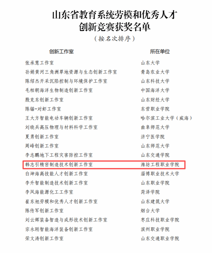 11月18日,山东省教育工会委员会公布了 2025 年山东省教育系统劳模和优秀人才创新竞赛结果,全省共有20个创新工作室获奖,我院“韩志引精密制造技术创新工作室”荣列其中。