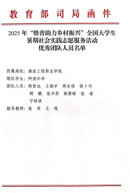 近日,教育部语言文字应用管理司、共青团中央青年发展部联合公布2025年“推普助力乡村振兴”全国大学生暑期社会实践志愿服务活动优秀团队名单,我院交通工程学院张芮、王琨两位老师指导的“普韵阡陌行”三下乡社会实践团从全国2000支团队中脱颖而出,获“优秀团队”称号。