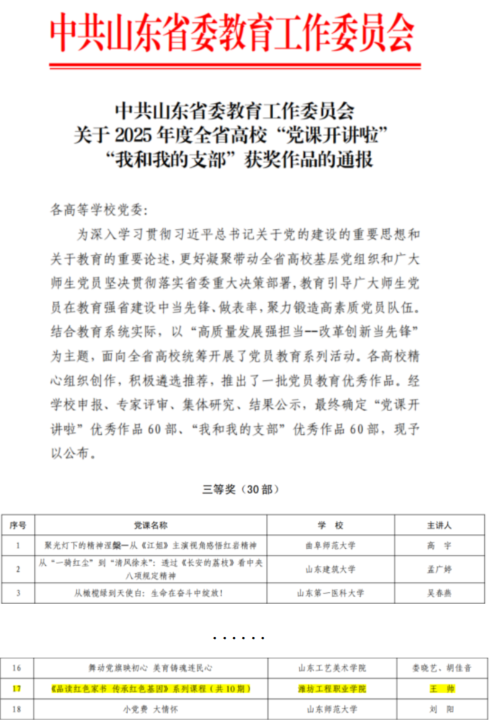近日,省委教育工委公布2025年度全省高校“党课开讲啦”活动获奖名单。我院学生工作处党支部教师王帅主讲的《品读红色家书 传承红色基因》系列课程(共10期)荣获三等奖。
