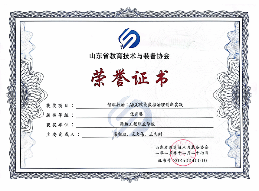 近日,山东省教育技术与装备协会公布2025年度高等学校信息化工作案例获奖名单,学院报送的《基于零信任的网络安全防护体系》获得网络与数据安全领域三等奖,《智驱数智:AICG赋能数据治理创新实践》获得数智赋能学校治理领域优秀奖。