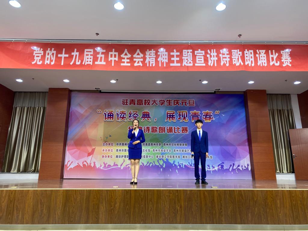 近日,由中共青州市委宣传部、共青团青州市委、青州市文化和旅游局、青州市阅读联盟主办的党的十九届五中全会精神主题宣讲暨驻青高校大学生庆元旦“诵读经典,展现青春”经典诗歌朗诵比赛在青州市图书馆五楼讲座厅举行。我院获优秀组织奖,参赛学生取得优异成绩。