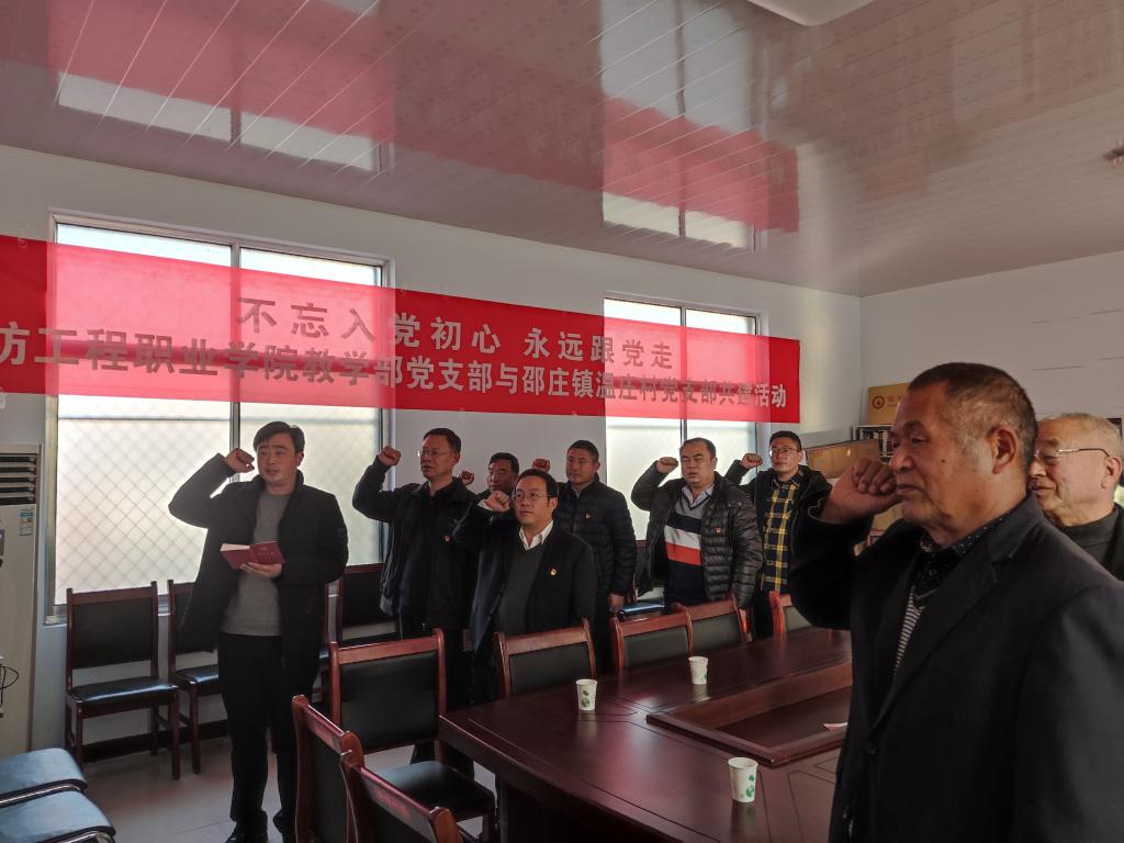 活动中,党员同志重温入党誓词,共同学习党章、党规、党纪等,通过学习进一步坚定了理想信念,增强了党组织凝聚力。随后中专教学部党支部赠送《中国共产党重要党内法规学习汇编》、《党员手册》、《中国共产党山东历史》等书籍给温庄村支部委员会,并走访慰问了老党员、老干部。此次活动,进一步提升了支部党员干部的党性修养,坚定了理想信念,筑牢了“不忘初心、牢记使命”的思想根基。大家一致表示要立足岗位,践行初心与使命,在岗位上作表率,为师生、为群众办实事、做好事,为学院发展做出自己的贡献。
