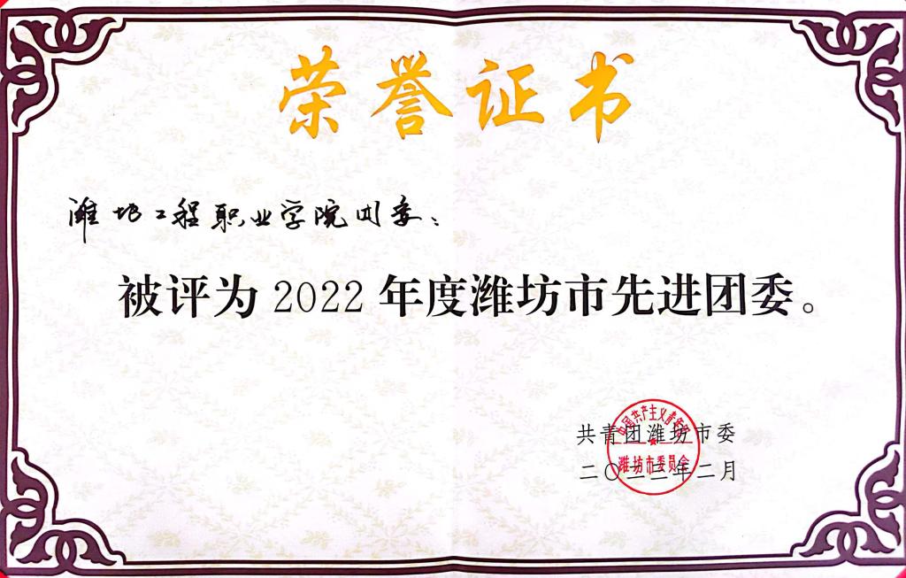近日,共青团潍坊市委发布《2022年度工作评价表扬通报》,我校团委荣获“2022年度潍坊市先进团委”荣誉称号。