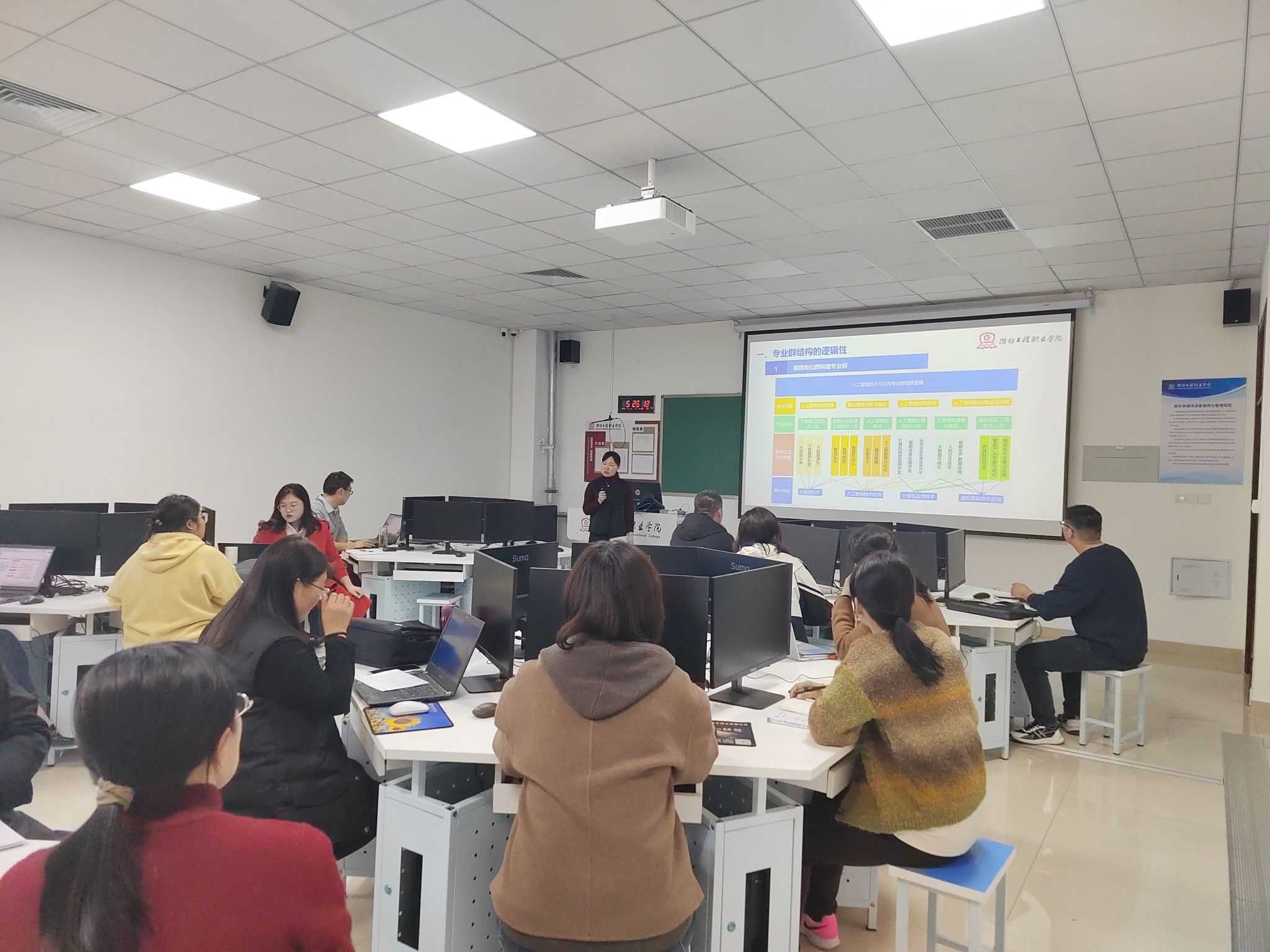 活动中,信息工程学院负责人围绕“新双高”标准框架要求,对人工智能技术应用高水平专业群开展需求分析和建设可行性论证;8位教研室主任围绕新版专业教学标准说专业不足与改进方案,明确专业人才培养方案与新标准之间的差距,梳理具体问题,并提出有针对性的改进措施。