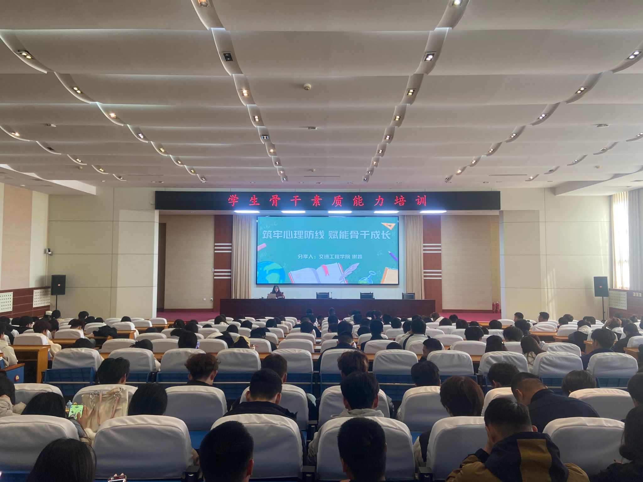 培训中,谢鑫老师以“筑牢心理防线,赋能骨干成长”为主题,结合辅导员和学生骨干的工作日常,从科学识别压力、筑牢心理防线、学会自我关怀、如何帮助他人四个层面,教育引导学生干部关注心理健康、科学应对心理问题,并与现场学生进行了互动交流。