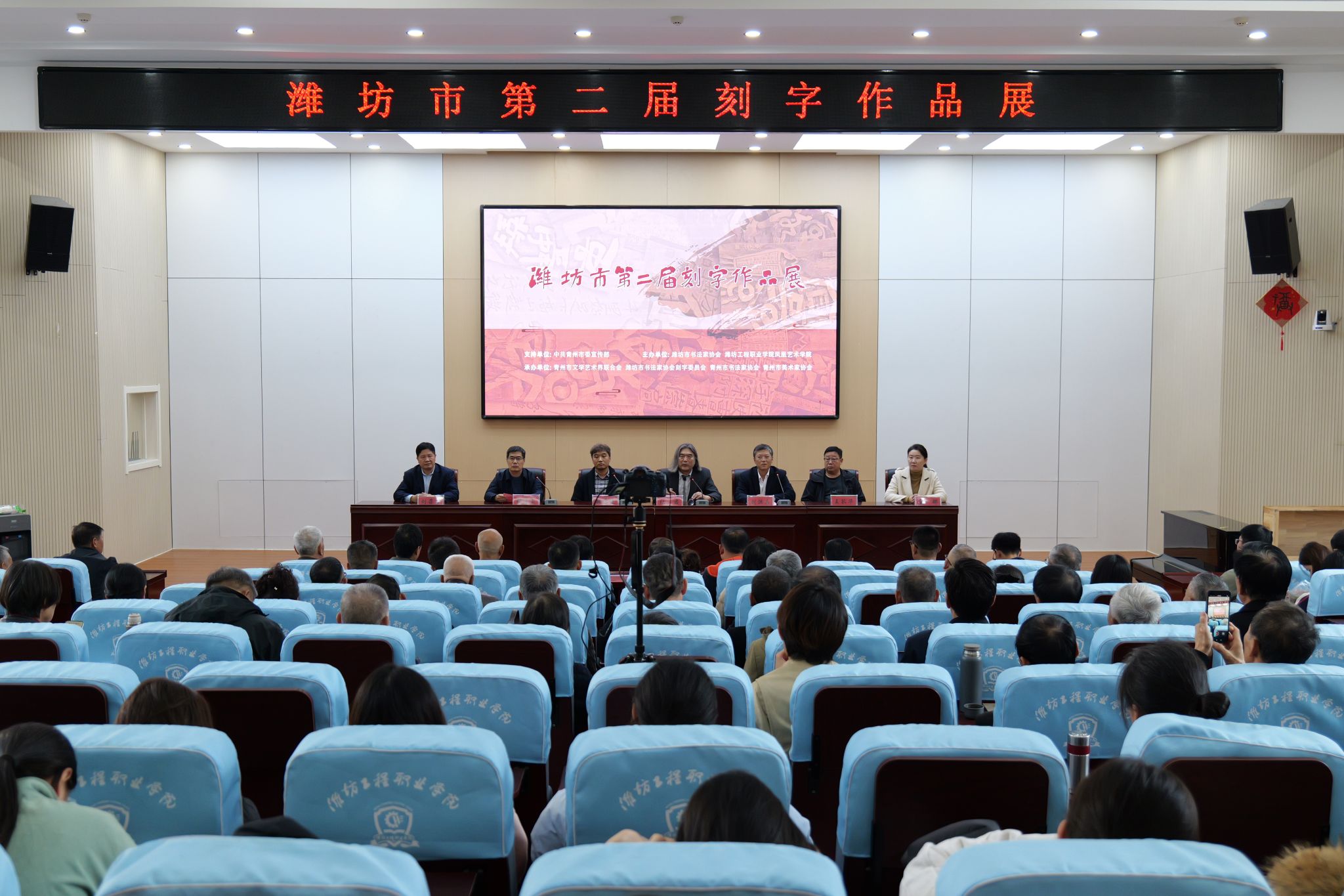 本次展览由潍坊市书法家协会、潍坊工程职业学院凤凰艺术学院、青州市文学艺术界联合会联合主办。山东省书法家协会顾问、潍坊市书法家协会主席纪君出席开幕式。潍坊市及青州市相关单位、凤凰艺术学院相关负责人,凤凰艺术学院师生代表参加开幕式。