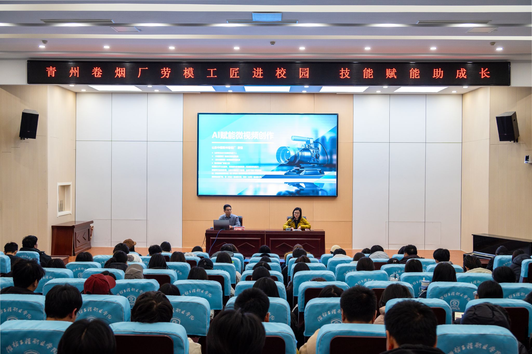 12月25日,继续教育学院举办“劳模工匠进校园”活动。活动邀请青州卷烟厂宣传干事、劳模工匠代表房强作专题报告。凤凰艺术学院摄影摄像技术、数字媒体技术专业学生聆听报告。