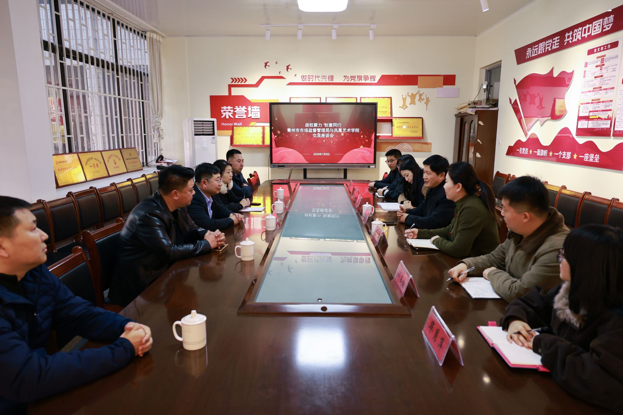 1月9日,青州市市场监督管理局一行到凤凰艺术学院交流座谈。青州市个体私营企业党委副书记刘明涛,青州市市场监管局、凤凰艺术学院相关负责人及专业教师代表参加会议。