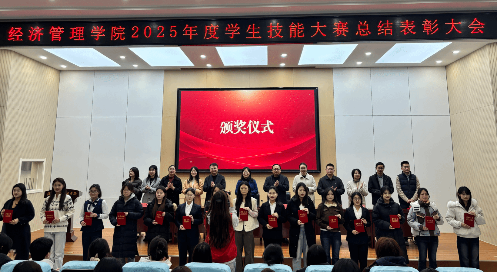 1月15日下午,经济管理学院在玲珑山校区报告厅举行2025年度学生技能大赛总结表彰大会。经济管理学院相关负责同志、教师代表及全体获奖学生参加。