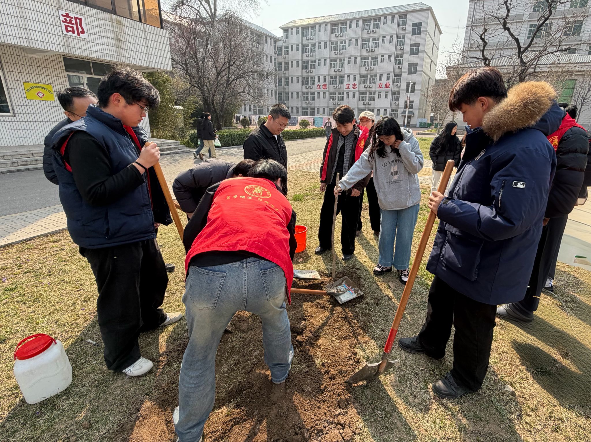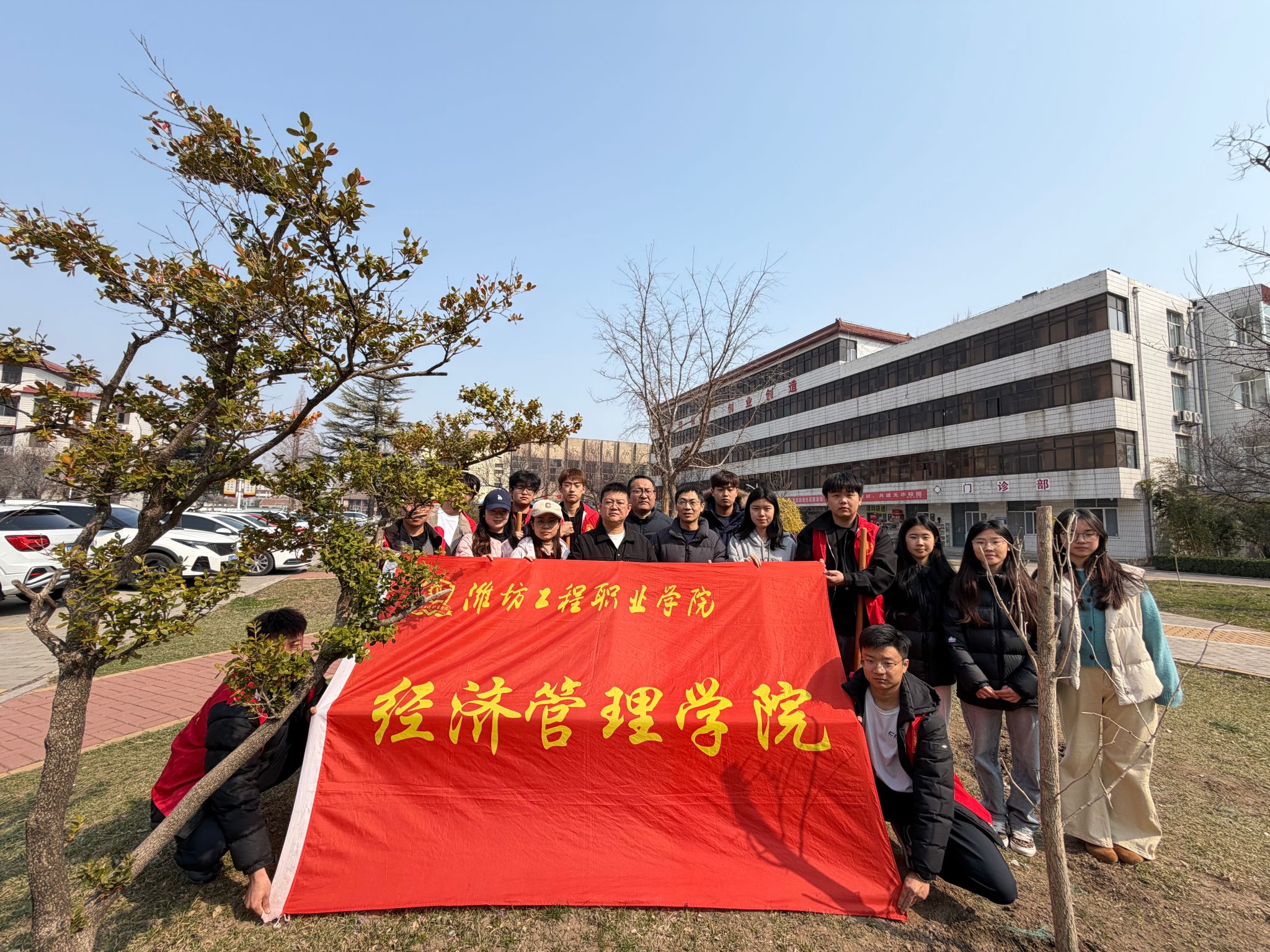 活动中,师生们手持铁锹、水桶等工具,分工协作,每一个环节都认真细致,活动共种植银杏、流苏等十余株树。此次活动是经济管理学院劳动教育体系中的重要一环,下步,经济管理学院将持续推进劳动教育与专业育人、文化育人深度融合,让青年学生以实际行动践行绿色发展理念,深化劳动教育内涵。